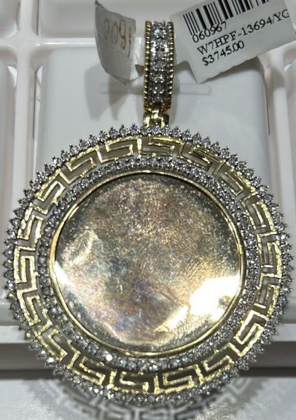 10K Yellow Gold Greek Key Round Coin Diamond Pendant
