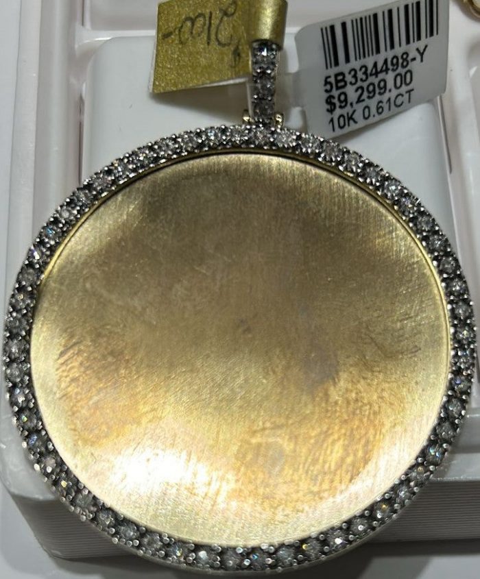 Elevate your style with this exquisite 10K Yellow Gold Round Coin Diamond Pendant. This luxurious pendant features a classic round coin design, beautifully framed by a halo of sparkling round diamonds. The diamonds, totaling 0.61 carats, are meticulously prong-set to enhance their brilliance and sparkle. The pendant also includes a diamond-studded bail, adding an extra touch of elegance and sophistication.