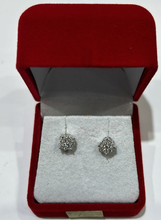 Discover timeless elegance with these diamond cluster stud earrings set in 18k white gold. Each earring features a cluster of brilliant-cut diamonds, carefully arranged to catch the light from every angle. Perfect for everyday wear or special occasions, these earrings make a wonderful gift for someone special. Crafted with precision, they offer both durability and lasting beauty. Whether you’re adding to your jewelry collection or gifting a loved one, these diamond earrings are sure to impress.