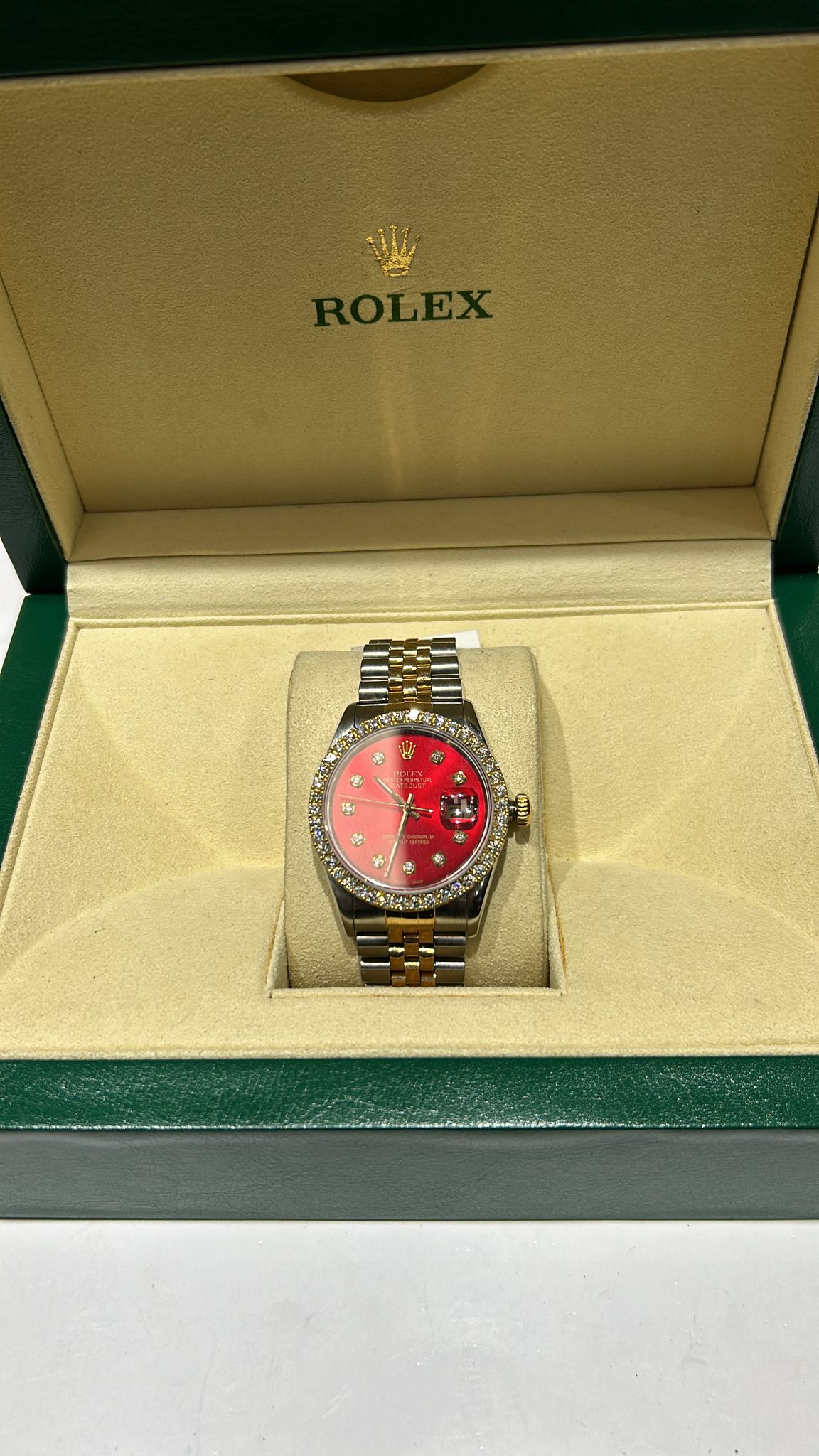 Elevate your style with this stunning Rolex Datejust Men’s Watch, featuring a bold red diamond-set dial that captures attention. Crafted from premium 18K gold and stainless steel, this timepiece showcases luxury and durability. The custom diamond bezel adds an extra layer of elegance, making this Rolex a statement piece for any occasion. With automatic movement and the iconic Rolex Datejust craftsmanship, this watch is perfect for collectors and enthusiasts alike.