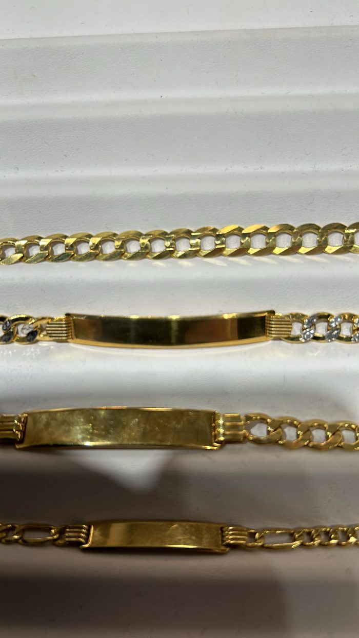 Elevate your style with this stunning set of 14K gold bracelets, featuring both Cuban link and ID plate designs. Perfect for both men and women, these bracelets offer a sleek, polished look that complements any outfit, whether casual or formal. The robust Cuban links ensure durability, while the blank ID plates allow for personal engraving, making this set ideal for a personalized gift. This timeless set is a perfect addition to your jewelry collection, showcasing the craftsmanship of fine gold.