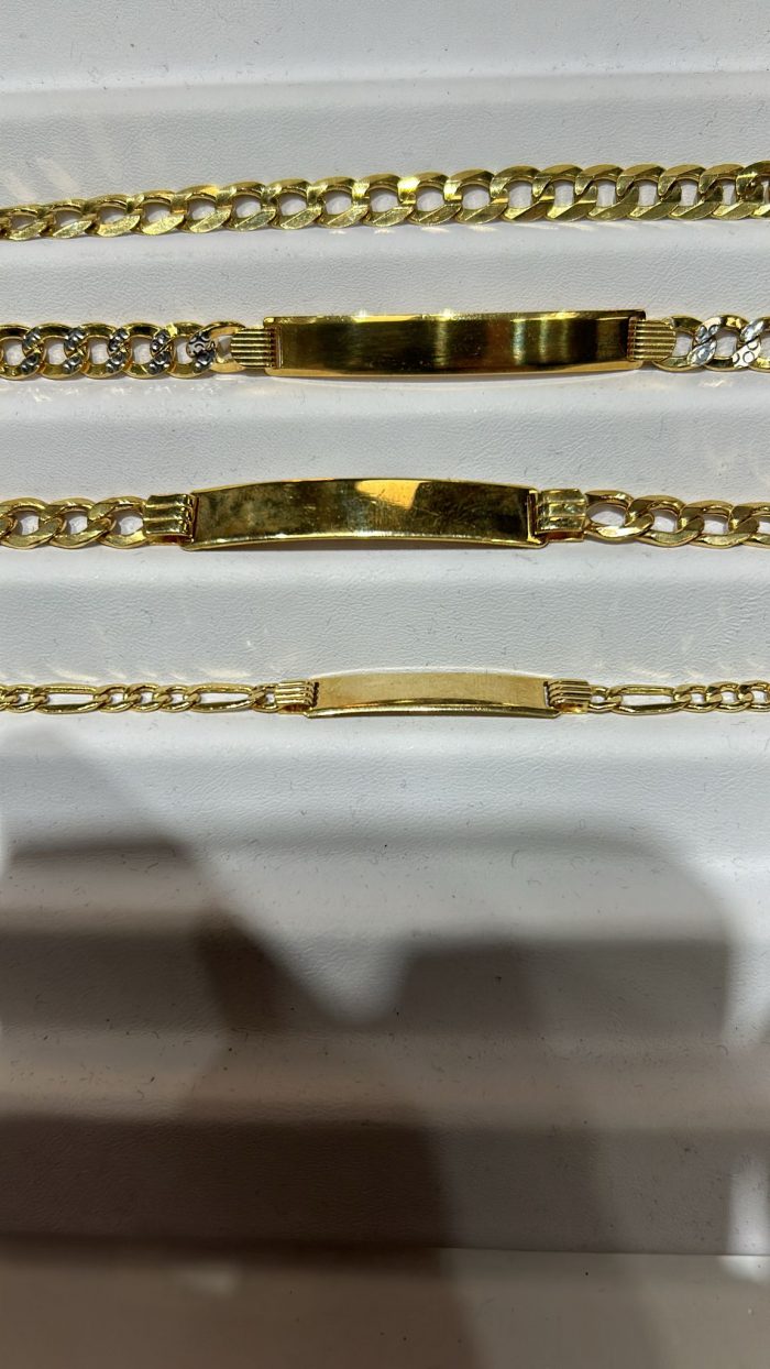 Elevate your style with this stunning set of 14K gold bracelets, featuring both Cuban link and ID plate designs. Perfect for both men and women, these bracelets offer a sleek, polished look that complements any outfit, whether casual or formal. The robust Cuban links ensure durability, while the blank ID plates allow for personal engraving, making this set ideal for a personalized gift. This timeless set is a perfect addition to your jewelry collection, showcasing the craftsmanship of fine gold.